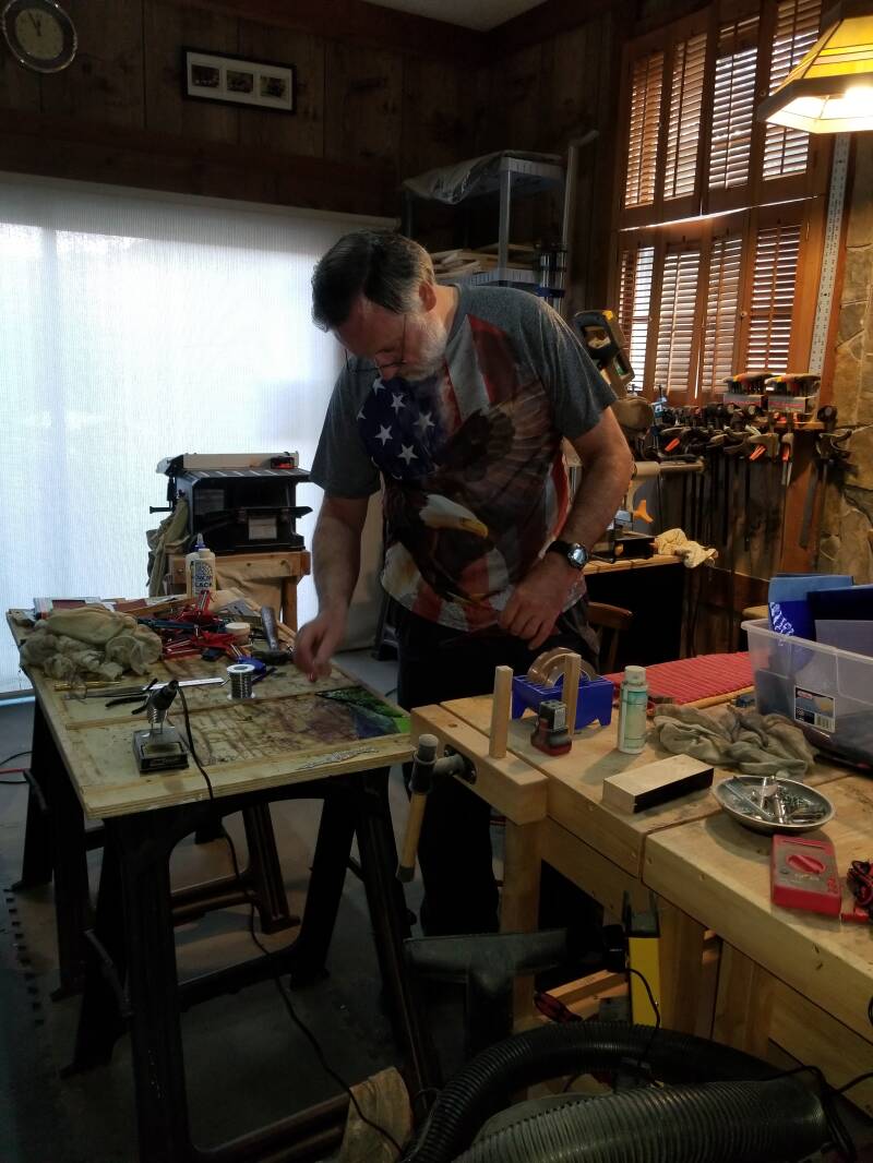 Russ Bethe moved to Roan Mountain, TN after being the head of Quality at an Automotive parts manufacturing firm in the Midwest. He has started making stained glass and oak based furnishings. Usable art. His style is inspired by the mountains he lives in. He tries to keep his cost low so that anyone can afford to have one of his items.