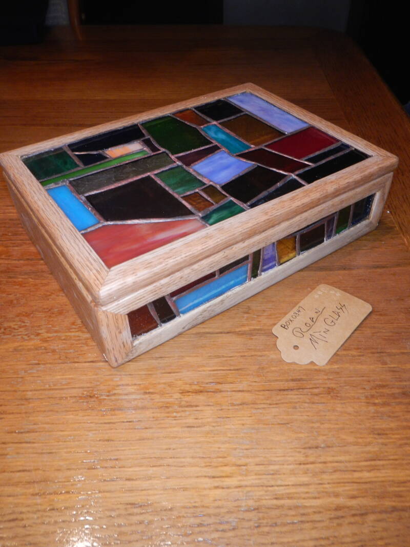 Box0054 Single layer box with Golden Oak finish. one pane of stained glass in black, white, yellow, red, and purple with Silver patina lead. Measures 10.5" x 7.5" x 3" $50.