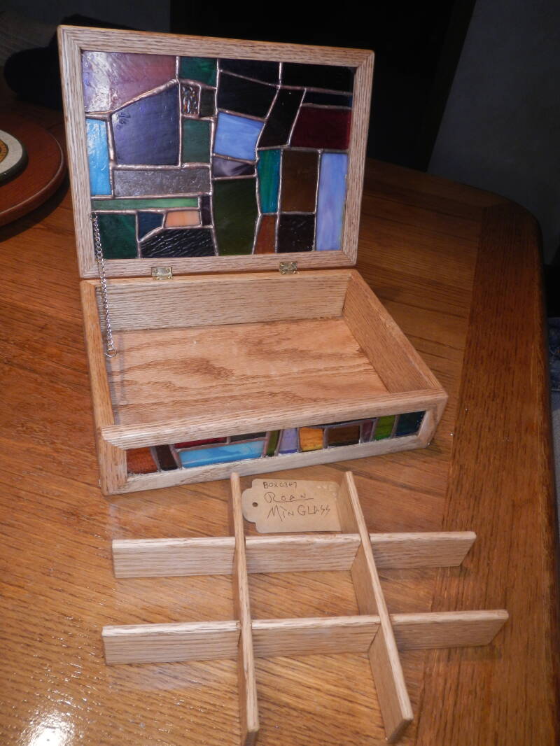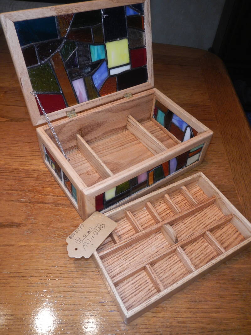 Box0263 Single layer box with Golden Oak finish. Removable dividers makes this perfect for use by men or women. Two panes of stained glass in black, white, blue, red, and yellow with black patina lead. Measures 10" x 8" x 3" $60.