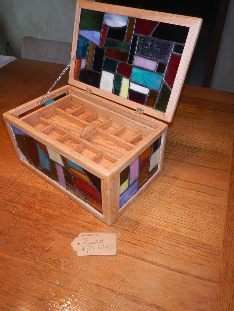 Box0347 Single layer box with golden oak finish. Two sides of stained glass making it a box of many colors with a black lead finish. Nine compartment dividers are rmoveable making it a graet gift for men or women. 10" x 8" x 3" $60