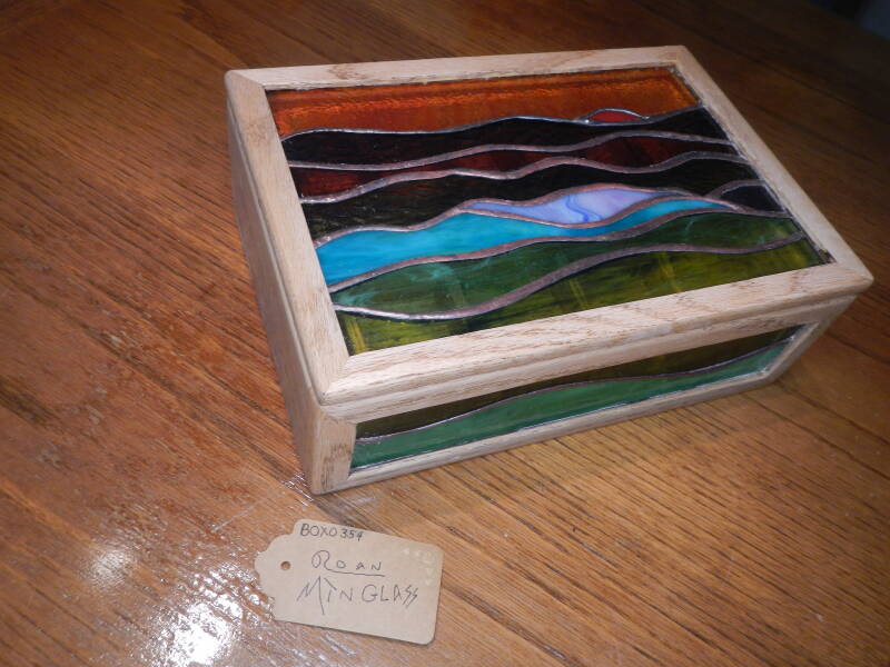 Box0354 Double layer box with Golden Oak finish. Removable divided compartment tray and three compartment area makes this perfect for use by men or women. Two panes of stained glass in shades of green, blue, purple, red, and orange sky with copper patina lead. Measures 11" x 8" x 3" $75