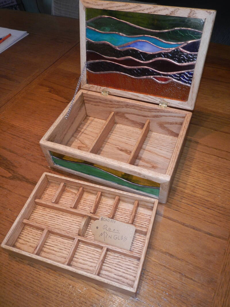 Box0320 Double layer box with Golden Oak finish. Removable divided compartment tray and open lower area makes this perfect for use by men or women. Two panes of stained glass in shades of green, blue, and purple with copper patina lead. Measures 12" x 8" x 3" $75