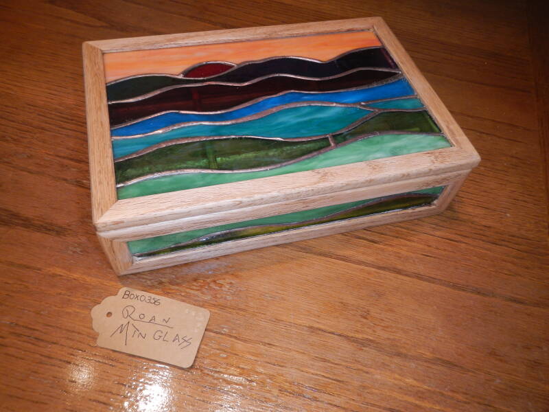 Box0356 Single layered box in golden oak hand rubbed finish. Removable 9 compartment divider is removable make this a great box for men or women, Two panes of stained glass with a blue ridge mountain scene in shades of green, blue purple, red and a orange white sunset sky. Measures 11" x 3" x 6". $60